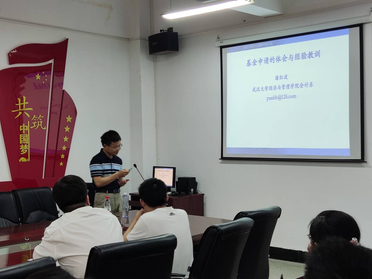 为鼓励yl23455永利官网教师积极申请高水平科研项目基金,解决青年博士在申请项目基金遇到的一系列问题,2022年9月15日上午,武汉大学经济与管理学院会计系主任潘红波教授莅临学院做题为“基金申请的体会与经验教训”的学术讲座。潘红波教授与教师和青年博士们分享了自己在基金申请过程中的感受和经验教训。本次讲座由院长赵立彬教授主持,学院行政领导班子和部分青年博士教师参加讲座。