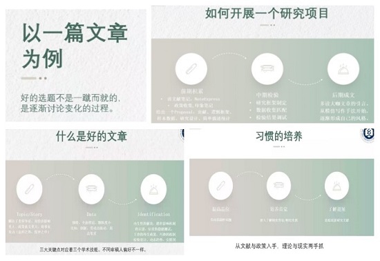 黄博士首先提出,我们应当从文献中学习到破题方法、逻辑推导,并从阅读的文献中积累外生冲击事件和变量的衡量。其次,黄博士强调了习惯的重要性,在日常做学术的过程中,应当提高品位、培养直觉、了解最新业界研究进展。在做学术时,应当从文献和政策入手,理论现实两手抓。在阅读文献的过程中进行思维拓展,要由浅入深、从多个层次角度思考问题。在开展一个研究项目时,要做到前期积累学习、中期仔细检验框架数据和结果、后期成文形成自己的风格。