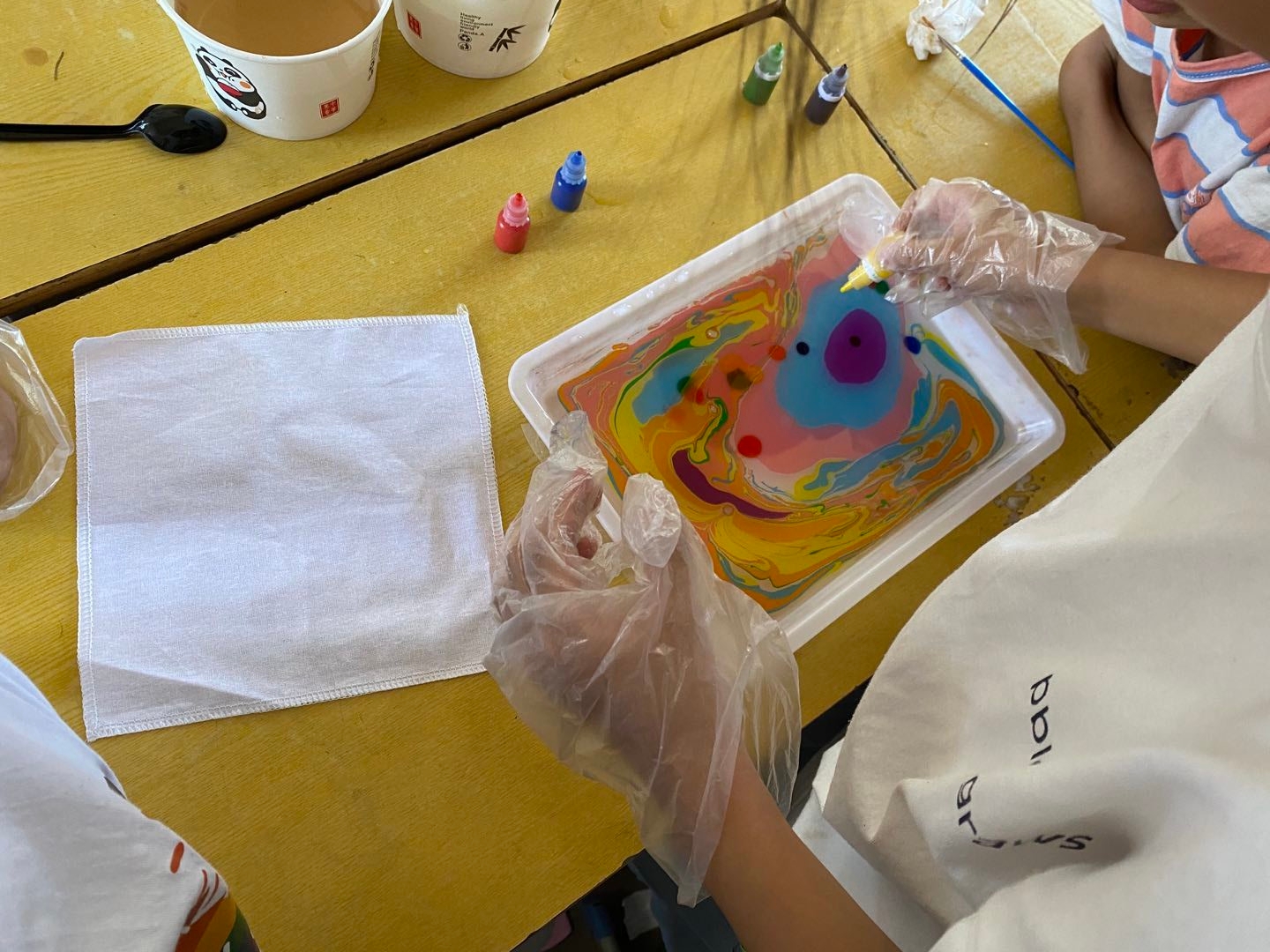 图为小朋友们展示自己动手制作的水拓丝巾,大家在制作过程中,于点滴墨色里感受文化瑰宝、窥望历史年华。中国青年网通讯员 卢慧敏 摄