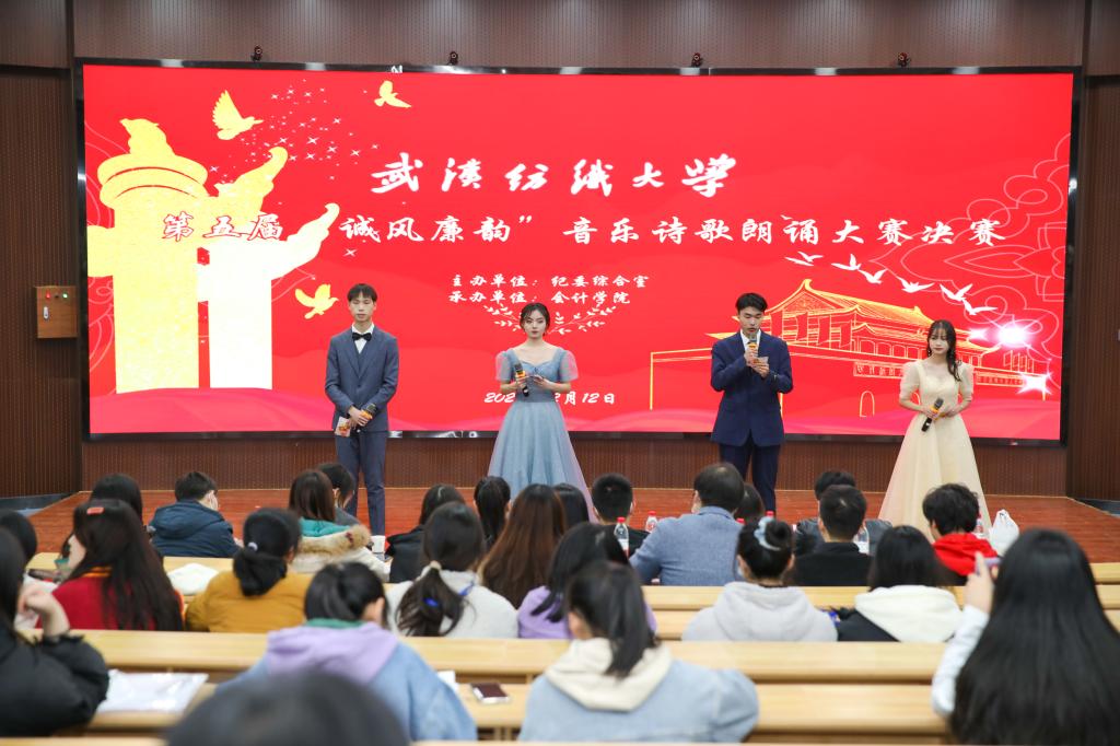 12月12日晚,由校纪委综合室主办,yl23455永利官网、青廉社承办的武汉纺织大学第五届“诚风廉韵”音乐诗朗诵大赛决赛在阳光校区崇志楼T201教室举行。各学院团委书记、副书记担任评委,二百余名师生代表参加活动。