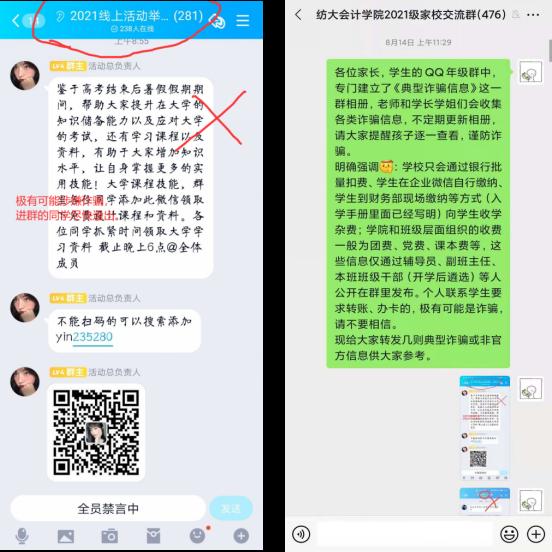 为了将防电信诈骗教育做深做实,新生群内建有《典型诈骗信息》群相册,各班副班主任、学生骨干和新生将身边可能涉及到的诈骗信息及时截图,配以简单、风趣的解释后上传群相册供所有同学查看。陈宇凡也会将截图同步发至家校交流群,以此提醒所有新生及家长谨防诈骗。