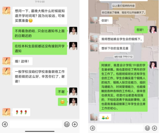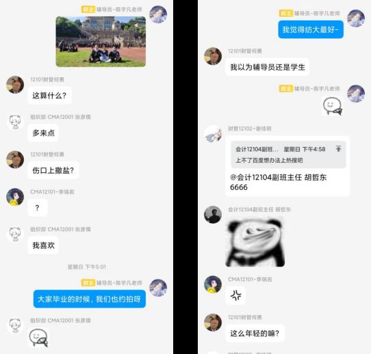闲暇之时,2021级学生辅导员陈宇凡老师也经常在群里与新生互动,大家相互“爆照”,提前增进了解,有的学生更是亲切地称呼她为“宇凡姐姐”。