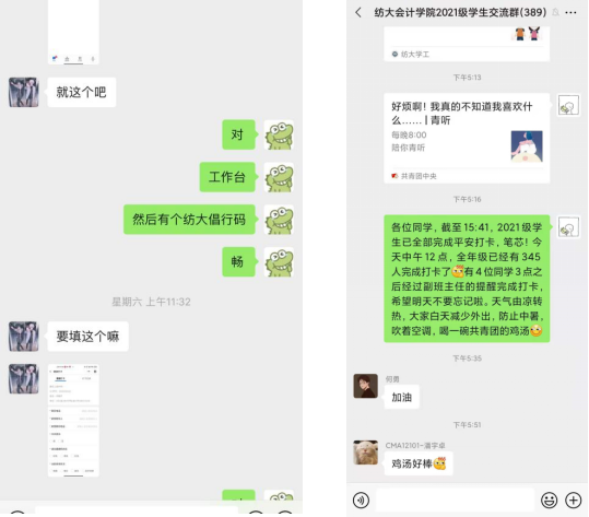 (图为副班主任指导新生如何打卡及陈宇凡在群内通报打卡情况)