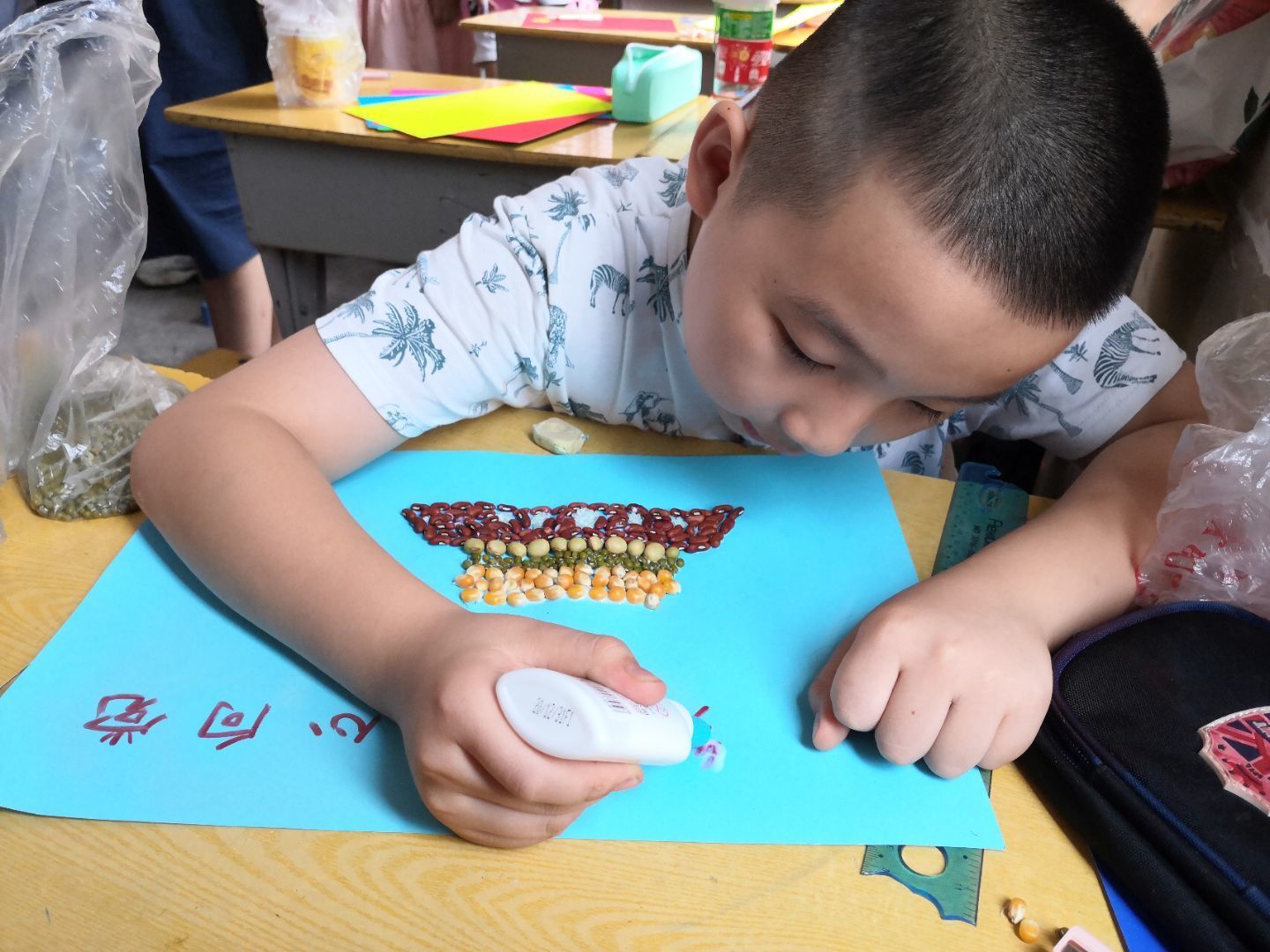 (小朋友用家中闲置的豆子画出天安门广场)