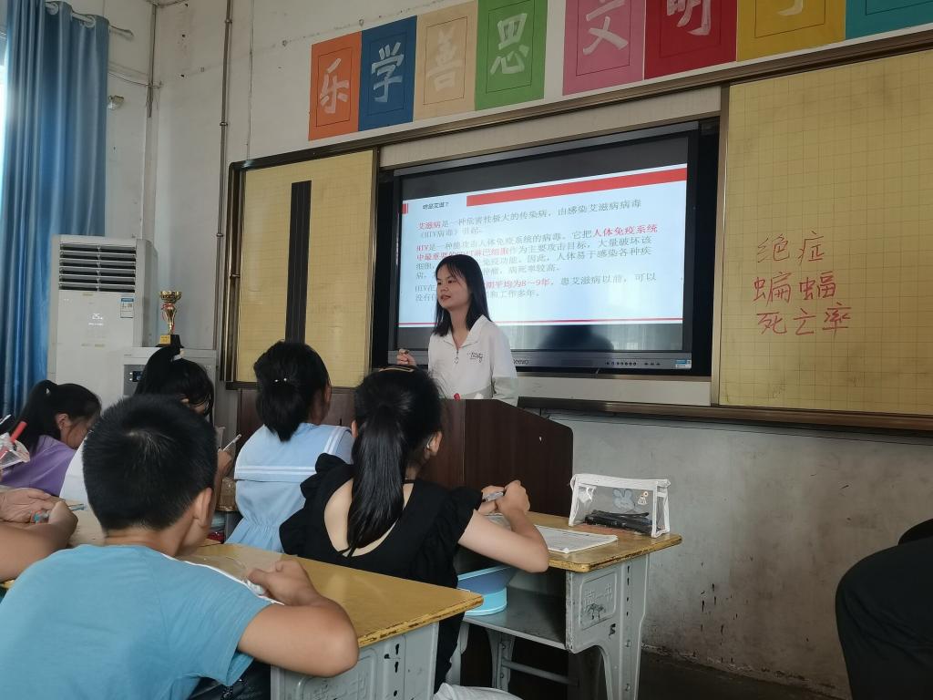 (志愿者为小朋友讲解艾滋病的相关知识)