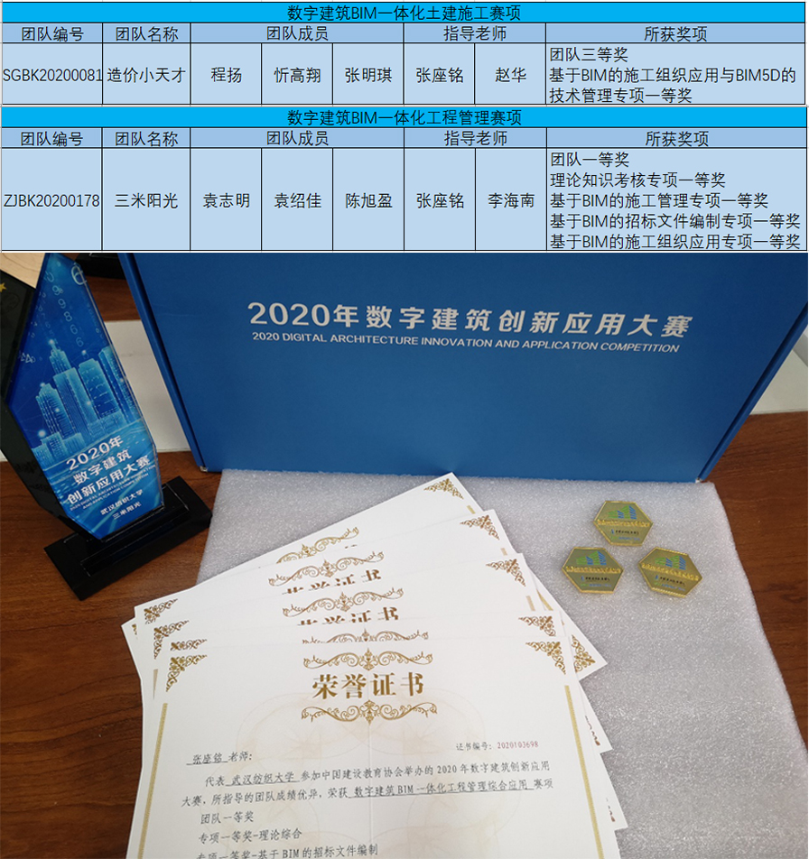 yl23455永利官网工程造价专业学生代表在张座铭、赵华、李海南三位老师的指导下取得优异成绩。其中,由袁志明、袁绍佳、陈旭盈组成的团队参与工程管理赛项,以第一的成绩夺得团队一等奖以及四项专项一等奖;由程扬、忻高翔、张明琪组成的团队参与土建施工赛项取得团队三等奖以及一项专项一等奖(具体获奖见下图)。
