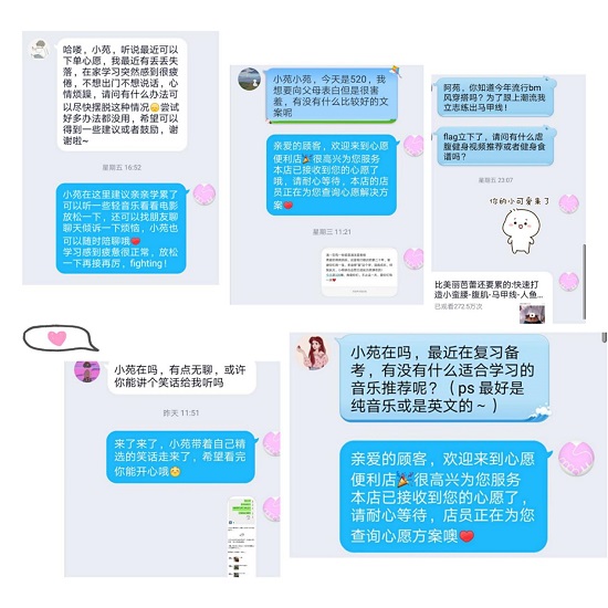 “心愿便利店“活动发出后便收到了许多同学的心愿订单。有的同学在考试当前感到烦恼想要建议和鼓励有的同学想在520和父母表白却没有好的文案有的同学感到无聊求推荐好看的电视剧想听好笑的笑话还有的同学最近对心理学感兴趣求推荐心理方面的书籍……还有很多很多心愿订单不一而足。在这里“心愿便利店”倾听同学们的烦恼和小小心愿尽可能的帮助同学们解决问题给同学们带来开心和快乐。
