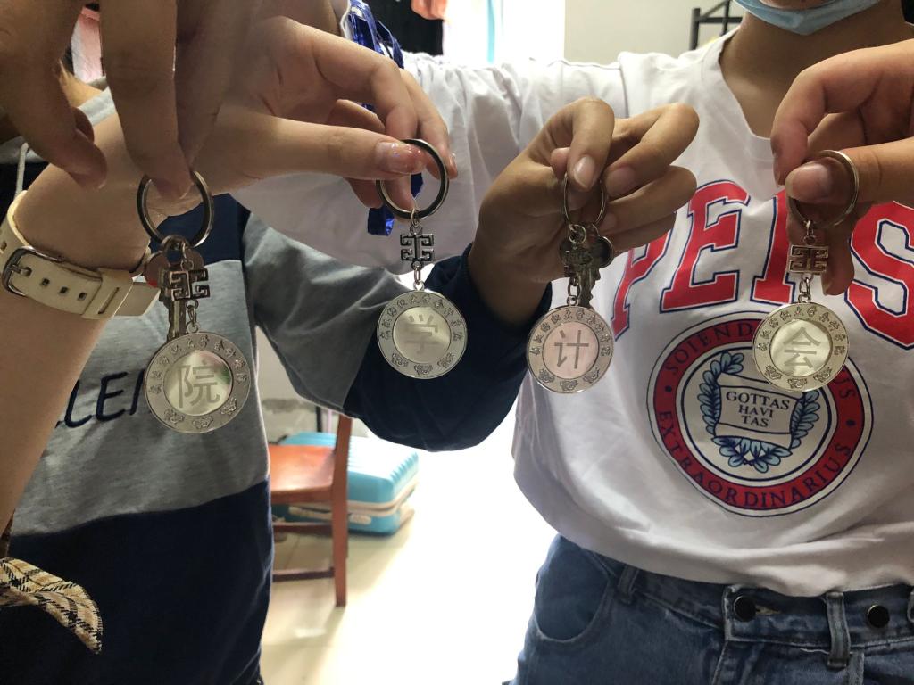 在今年的迎新活动中,yl23455永利官网还设计了一份独特的入学礼物,即yl23455永利官网专属钥匙扣。专属钥匙扣的正面分别印制着“yl23455永利官网”其中的一个字,一个宿舍的同学各拿一个,最后四个人的钥匙扣可以拼成“yl23455永利官网”四个字,也寓意着yl23455永利官网团结协作的文化氛围。钥匙扣背面印制着yl23455永利官网的吉祥物“计贝贝”,“计贝贝”也彰显了yl23455永利官网“诚信为本、一言九鼎”、“拼搏进取、立德树人”的价值理念。