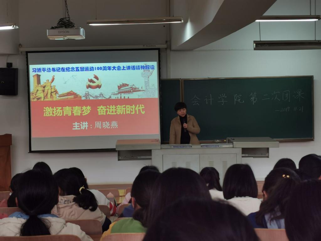 周晓燕解读了习近平总书记在纪念五四运动100周年大会上重要讲话精神。深切缅怀五四先驱崇高的爱国情怀和革命精神,响应习总书记提出的新时代发扬五四爱国、民主、进步、科学的精神。从敦煌女儿樊锦诗到焊王王天明,从四川大凉山的救火英雄到艰苦奋斗的快递小哥,从默默奉献的徐本禹到南京青奥会志愿者张璐,这些各行各业中从血与火的洗礼、苦与痛的奋斗中走来的年轻人,他们开拓进取、闯关夺隘的精神深深的感动了在座的每一位同学。