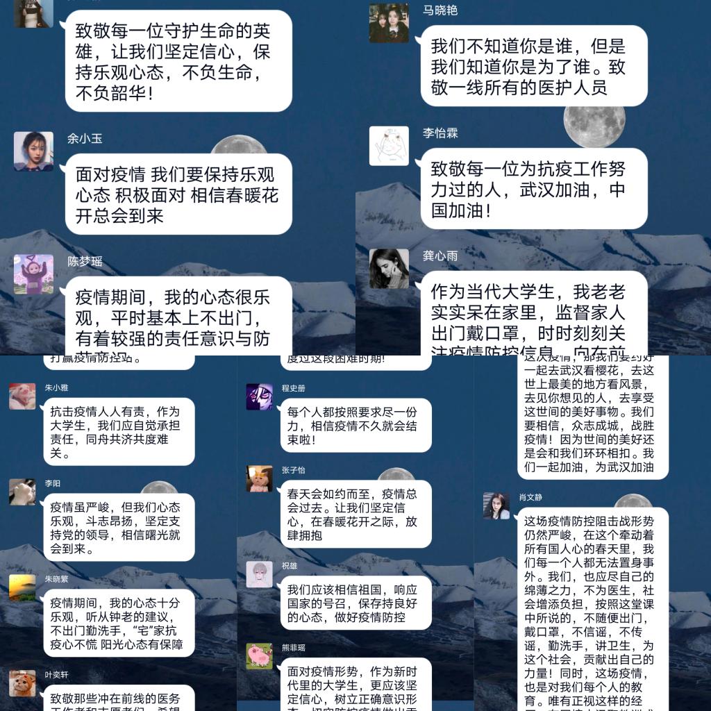 在讨论环节,同学们分享自己了解的防“疫”小知识,自己面对疫情的心情体会,讲述最令人感动的逆行者们的故事,同时承诺不信谣、不传谣、不造谣,做一个抗“疫”阻击战的参与者贡献者。