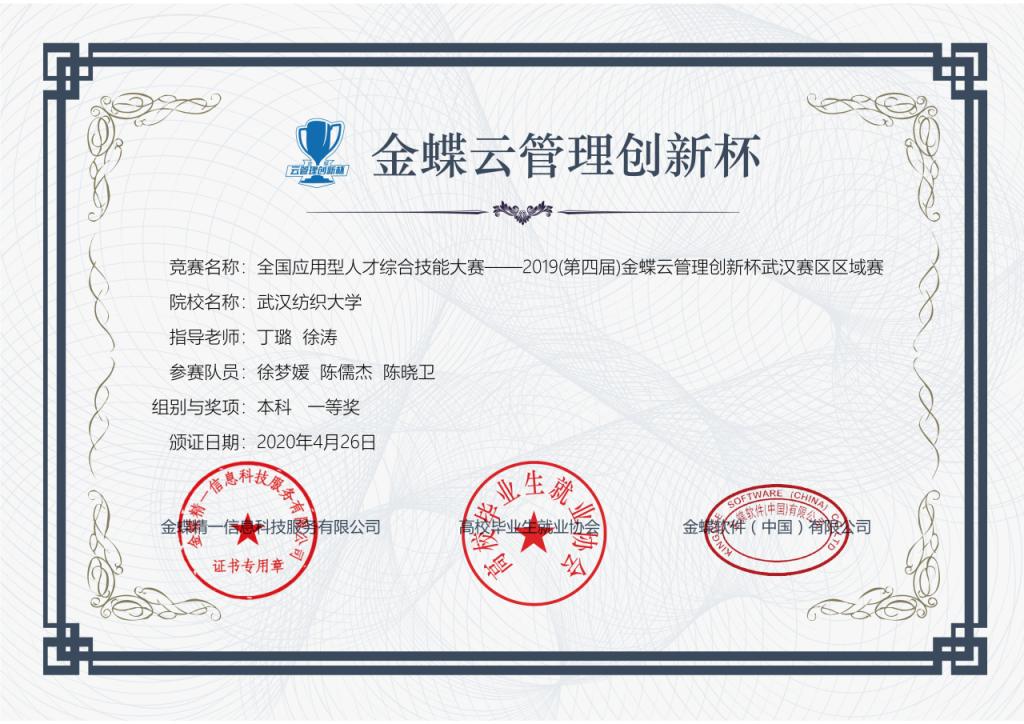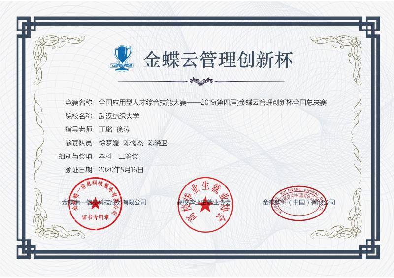 经过两个月的训练和准备,我院师生411号参加了第四届全国金蝶云管理创新杯综合技能大赛湖北省区域赛,丁璐老师和徐涛老师指导的无敌队获一等奖,俞红老师和张耀武老师指导的五颜六色队获二等奖;516,丁璐老师和徐涛老师指导的无敌队继续努力闯入全国总决赛,面对中央财经大学、上海立信会计金融学院、山西财经大学、天津财经大学等众多强手,充分展示了我院风采,获得全国总决赛三等奖。