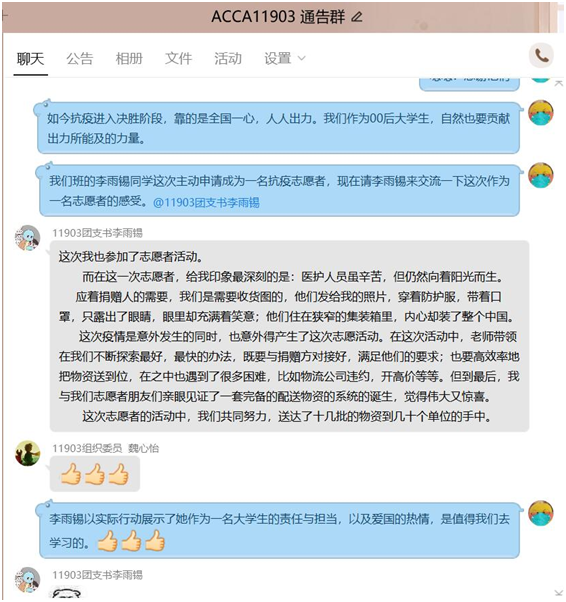 ACCA11702班甘岱麟:我从最开始的担忧惶恐,到自我隔离时的理智冷静,到隔离结束后逆风而行成为一名基层党员志愿者,在小区值守的26天让我收获太多太多。最开始,家里出于担忧并不支持我外出做志愿者,作为党员,我应该在国家有难的时候主动请缨而站出来。用眼睛看,用耳朵听,用心在认真感受,我知道每一个人都不容易,我知道每一个数据背后都是一个支离破碎的无辜家庭。我理解拼在一线的人们的辛苦,我见过没有昼夜之分的医护人员,见过寒冬雪夜在路口撑伞守卡的交警,见过和我一样默默在努力的无数基层志愿者们,每一个人都以自己的方式为这场抗疫战在努力着,辛苦吗?确实辛苦,但总有人比你更努力,大家的目的只有一个,让我们生病的城市快点好起来。共产党向人民交了一份满分答卷,中国也向世界交了一份满分答卷,美美与共,天下大同。此生无悔入华夏,来世还在种花家,我爱党,我爱我的祖国!”