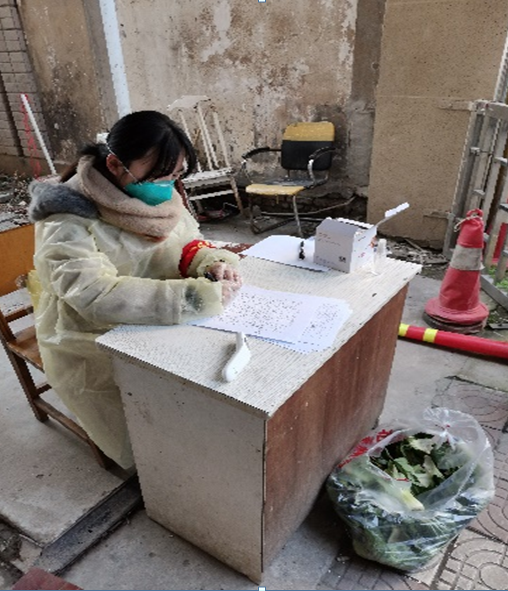 2月16日,省政府进一步发布了社区实行24小时最严格的封闭式管理要求,所有小区只保留一个出入口,所有居民不得随意出入社区。为了配合物业防疫工作的排查和巡逻工作,从2月17日开始,蒙雅恬同学被分配到社区门口记录小区出入人员情况和测量进入小区人员体温的工作。做好安全防控的她,每天早晨和其他下沉干部们一起在小区门口的驻点发放防疫物资、记录出入人员情况和测量进入小区人员体温工作。重点对于疫情防空的薄弱环节,不会使用智能手机,也不知道如何在网上团购食材和日用品的小区老年人们,每碰到这些老年人蒙雅恬同学都会耐心细致地告诉他们如何打电话给小区外的超市订购食材,并亲自去超市为他们取来所订购的菜品和物资。在她值班的三天时间内累计登记进出人员200多人次,未发现小区内居民存在人传人的疑似疫情情况的发生。