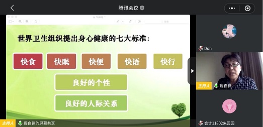 周老师普及了心理健康的标准是“五快”、“两良好”即:快食,快眠,快便,快语,快行;良好的个性特征,良好的人际关系。并且,周老师还强调了人际关系有助于健康,而孤独有害于健康;人际关系不在于数量,而在于质量;良好的人际关系不仅可以维护身体健康,更可以维护大脑健康,只有真正做到这些方面才是真正的身心健康。