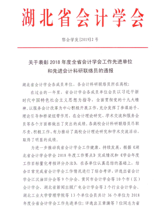 20191月,湖北省会计学会对2018年度积极开展理论研究、参与学术活动、培养会计人才、为省会计学会的发做出贡献的单位及个人进行了表彰,yl23455永利官网获评全省先进单位会员,施梅艺兰老师获评先进会计科研联络员称号。