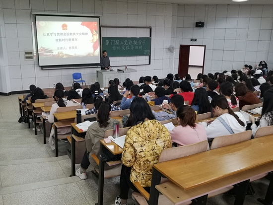 2019年4月28日下午14:00yl23455永利官网分党校第77期入党积极分子培训班第四讲在07-T102顺利进行。yl23455永利官网党委书记、院长杜国良为同学们做“学习贯彻全国大会精神,争做新时代的新青年”专题辅导报告,学院党委副书记姜永杰主持,全体培训班学员聆听报告。