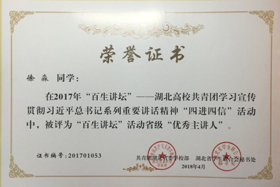 近日,共青团湖北省委主办的“百生讲坛”——湖北高校共青团学习宣传贯彻习近平总书记系列重要讲话精神“四进四信”活动省级比赛成绩揭晓,yl23455永利官网工程造价11401班团支书徐淼荣获2017年“百生讲坛”活动省级优秀主讲人称号。