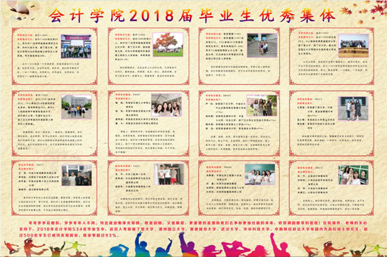 考研情况简介:会计11407班共有35人,19人参加2018年度的研究生考试,报考率高达40%,其中8人陆续获得中南财经政法大学、武汉理工大学、中国矿业大学、诺丁汉大学等国内外高校硕士研究生入学资格。