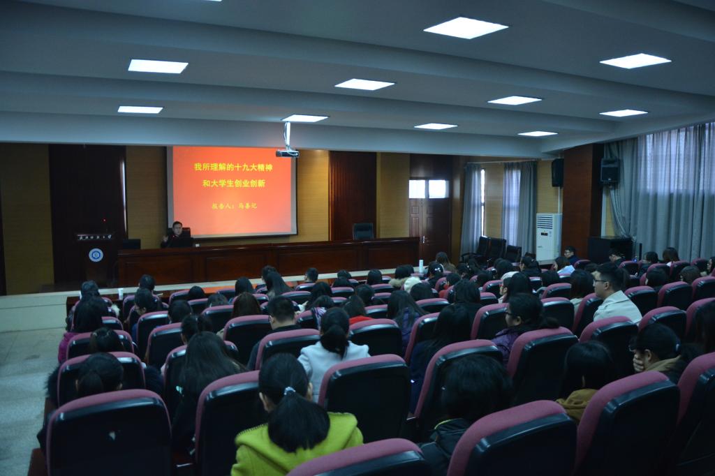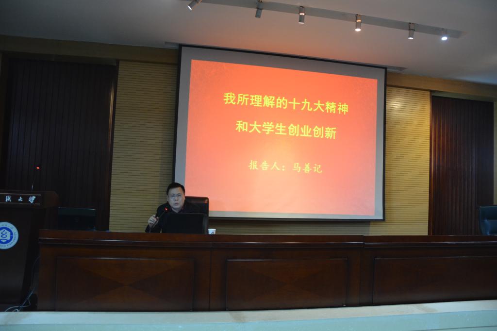 12月22日上午,新浪“亿万名博”博主、知名娱评人我校襄阳校友会副会长马善记应yl23455永利官网邀请,在阳光校区行政楼二楼报告厅为广大学子作了题为《我所理解党的十九大精神与大学生创业创新》的辅导报告,宣讲党的十九大精神,并围绕大学生普遍关注的创业创新问题为大家进行了交流。yl23455永利官网党委书记、院长杜国良主持报告会。