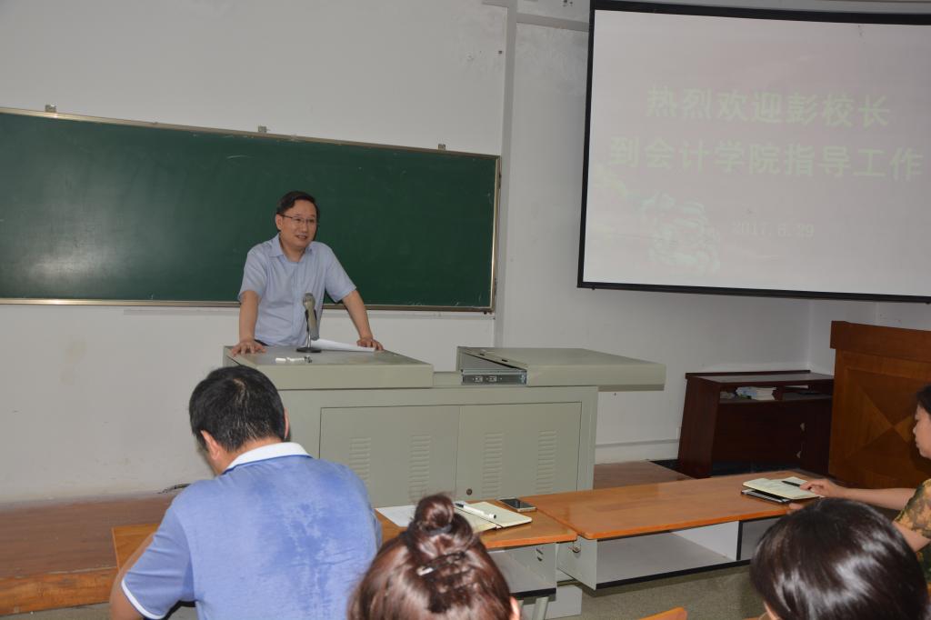 彭育园对yl23455永利官网近年来的发展表示肯定,他指出,yl23455永利官网自组建以来,优势学科有了新的发展,做出了会计特色。他表示,此次来yl23455永利官网调研,一是看看老朋友,结识新同事,感谢大家近几年在人才培养、学科建设和学校事业发展中作出的努力和贡献。二是实地了解学生实训场地、会计硕士学位点评估等方面的情况,掌握学院办学过程中存在的问题和困难,征询大家的意见和建议,学校将结合高水平特色办学目标和“双一流”建设的路径要求,通盘考虑、重点出击。三是科学谋划未来发展,希望学院坚持以往优良的办院治院作风,科学合理配置资源,加快师资队伍建设,巩固提升本科生、研究生培养质量,完成好第一使命,把学生培养成社会欢迎、社会接受的人才。