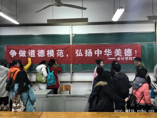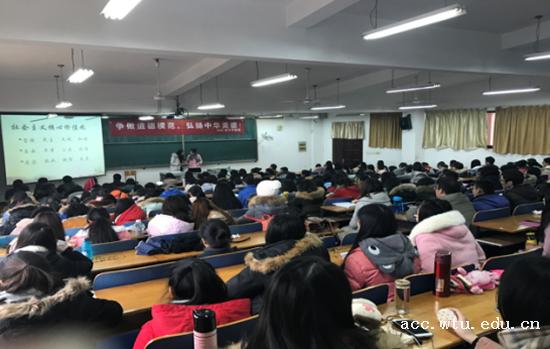 为加强学校道德文化建设和学生的道德素质培养,2016年11月23日下午,由武汉纺织大学党委宣传部主办,yl23455永利官网承办的“武汉纺织大学道德讲堂”在阳光校区3号教学楼217教室开讲