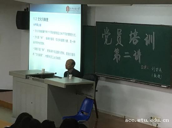 刘书记以“坚定中国特色社会主义文化自信”为主题,深入浅出,结合当代大学生党员现状,为yl23455永利官网全体党员提出了细致的建议。刘书记指出,要坚定中国特色社会主义文化自信,需要注意以下几个方面:第一,认真学习十八届六中全会公报的要求:全党同志必须把对马克思主义的信仰、对社会主义和共产主义的信仰作为毕生追求,坚定对中国特色社会主义的道路自信、理论自信、制度自信、文化自信。其次,了解文化、制度、制度文化的涵义与区别,积极学习知识,提升思想内涵。再周密的制度也不能凡事都规定到位,而文化则会让组织与成员形成心里契约,引导双方朝着共同愿景努力。第二,执行制度是最大的制度文化建设,有制度不执行是对制度最大的破坏。要注意实践与理论相结合,有效利用相关机制。第三,要振兴民族产业:越是超越民族,才可能征服世界。用自身民族的文化特点为世界的多样性做贡献,而不是自身文化已经征服世界。最后,教授为我们分析了精英文化与大众文化、艺术家与企业家的区别,提出了好的文化应该具备多种特性:娱乐性、参与性、时尚性以及实用性。