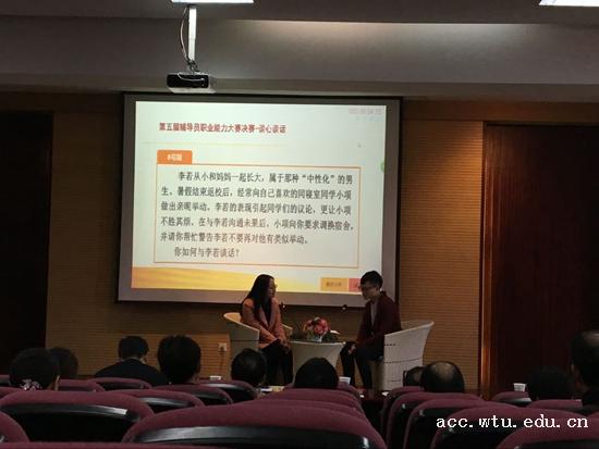 11月11日,武汉纺织大学第五届辅导员职业能力大赛决赛在行政楼2楼报告厅举行,我院辅导员陈竹君、彭慧分别荣获一等奖和三等奖。