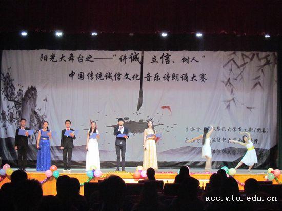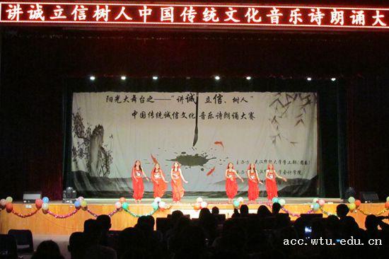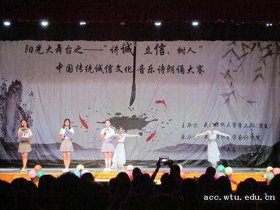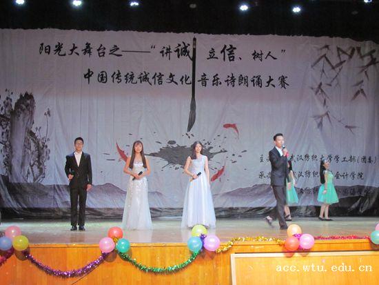 比赛在一曲热舞《worth it》后正式拉开序幕。音乐伴着朗诵,掷地有声的说辞,各院都以不俗的表现给观众们带来了心灵的震撼。有的学院别出心裁,在朗诵中插入剧情,直击现实要害。还有学院在朗诵中融入古风、汉服,更有诚信版《青花瓷》唱出对诚信的向往。舞台剧与朗诵结合,翩翩舞姿,温婉配乐,动人心弦。曾子杀猪,一诺千金,信义兄弟……引经据典,诚信一直都在。