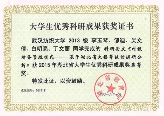 同样荣获三等奖的是2013级学生李玉琴、邹迪、吴文倩、白明亮和丁文丽组成的团队,他们的论文题目是《村级财务管理模式——基于湖北省大悟等地的调研分析》。这团队最大的亮点就在于实地考察,据他们的队长李玉琴陈述下乡调查的时间在暑假,天气很炎热但成员们为了更好的了解大悟村的财务状况,依然到当地财政局进行调查。考察后,在指导老师胥朝阳教授辅导下,最终完成了论文。