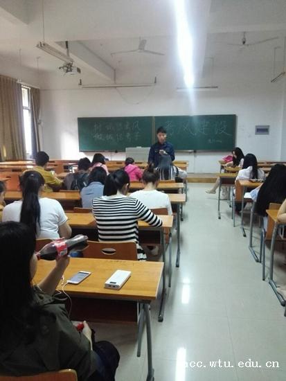 班会由各班班长主持,组织委员负责拍照记录班会内容。每个班班长首先认真宣讲诚信在考试中的重要性,“以诚待人,以诚做事”,一位班长在班会中这样对同学们说到。之后班长将学院关于作弊情况的相关处分公示于同学,让他们了解到学院对于作弊情况严惩不贷的态度。同时,各班还组织了诚信应考的签名活动,在之后自由发言的环节中,很多同学都表达了自己的看法,对有疑问的地方也积极发问:“如果自己无意把与考试相关的内容带入考场怎么办?”、“如果被误以为作弊怎么办?”……对于这些问题,班长也一一回答,尽量保证每个人都能诚信面对,顺利考试。