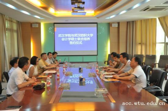 7月9日上午,武汉纺织大学与武汉学院会计学硕士联合培养签约仪式在武汉学院光谷校区举行。我校研究生处处长李相朋、yl23455永利官网院长杜国良、财务处处长胥朝阳、研究生处副处长周平,武汉学院校监林倩丽、助理副校长康贤刚、会计及金融学院名誉院长欧阳红兵等出席了签约仪式。