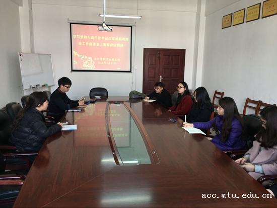 同时,辅导员组织各班级积极开展班会学习习近平总书记在新闻舆论工作座谈会讲话的重要精神。在学生发言中,会计专业的彭磊同学说到:作为一名新世纪的大学生,在学习了其讲话精神后,我认识到了党中央对新闻舆论工作的高度重视和殷切期望,我将在学习生活中切实的进行贯彻与执行,切实把思想和行动统一到讲话精神上来。