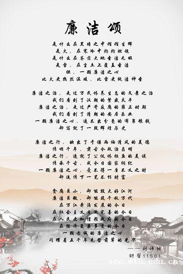 为积极推动高校廉洁文化的创造与传播,促进广大学生树立勤俭廉洁意识,培育节约型校园文化,引领廉荣贪耻的社会风尚。武汉纺织大学特举办2015年“阳光清风”廉洁诗歌短文大赛,本次活动持续数星期,各二级学院积极投稿参赛。大赛由武汉纺织大学纪委(监察处)主办,yl23455永利官网分团委承办。