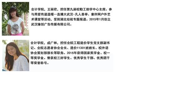 而王丽君同学则曾担任第九届校勤工助学中心主席,也曾受到湖北经视专题报道,并于2015年1月创立武汉缘创广告传媒有限公司。面对这样的成就,她认为:生活就是一步步的向前进,不断努力,终究会有收获。
