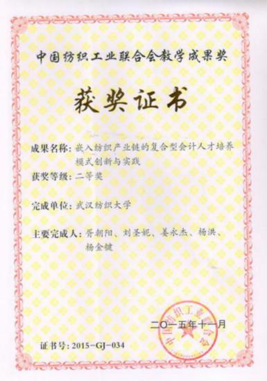 1.荣获中国纺织工业联合会教学成果奖二等奖2项、三等奖1项,获湖北省大学生优秀科研成果二等奖1项、湖北省挑战三等奖1项,人才培养质量不断提高。