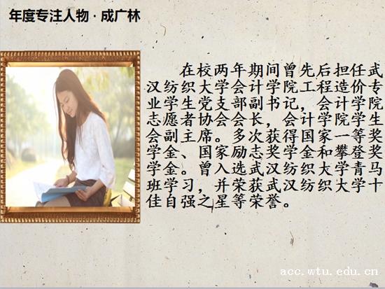 在校两年期间曾先后担任yl23455永利官网工程造价专业学生党支部副书记,yl23455永利官网志愿者协会会长,yl23455永利官网学生会副主席。多次获得国家一等奖学金、国家励志奖学金和攀登奖学金。曾入选武汉纺织大学青马班学习,并荣获武汉纺织大学十佳自强之星等荣誉。助人为乐,她用奉献与爱心铸成一道彩虹。关爱孤寡老人,她给老人送去温暖;山区支教,她给深山学子带去知识和关怀。满怀热情,她在真诚的奉献中成就自我,她就是年度专注人物—广成林