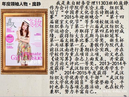 能力卓越,工作负责,她是领袖中的杰出人物。作为班长,她是班级力量凝聚的核心;作为学生会主席,她是yl23455永利官网学生的榜样。她用汗水浇灌学业,她将激情赋予工作。他用自己的智慧和行动带领yl23455永利官网学生会不断向前。她就是年度领袖人物——庞静