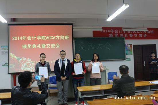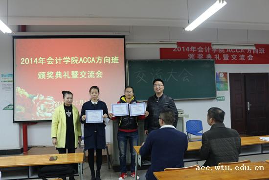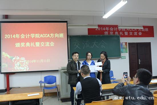 会上,陆畅总监、胥朝阳院长为刘聪同学颁发奖状和奖金,田毅经理、熊敏副书记为在ACCA考试中取得校单科第一成绩的冯若曦、黄慧同学颁奖。ACCA常务副主任杨金健老师代表ACCA上海代表处为优秀学员黄慧、杨紫璇、魏美萍等学生颁奖。随后,刘聪等几位同学向大家分享了自身学习经验、应试技巧,并详细介绍了出国留学相关注意事项。