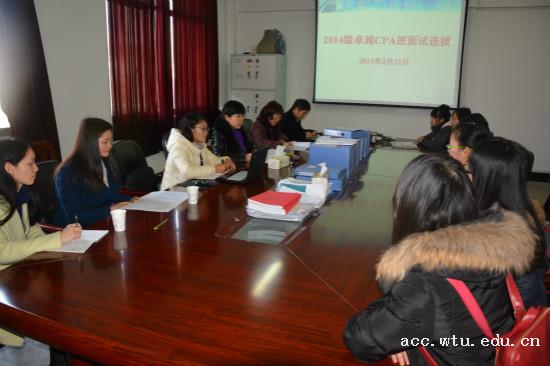 3月12日下午,我院2013级“卓越CPA特色班” 选拔面试在阳光校区七号楼举行。CPA特色班负责人刘圣妮副教授为参加此次面试选拔的同学阐述了“卓越CPA特色班”开设的意义、开办历程、培养模式及就业方向,为广大同学作了进一步动员。大信会计师事务所武汉分所所长索保国、学院院长胥朝阳、副院长刘书兰等老师担任了本次面试评委。