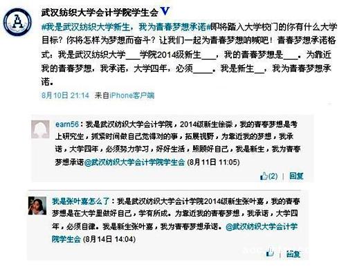 yl23455永利官网自8月初通过各种途径与2014级新生建立紧密联系起,依托新生入学前的励志情节,通过官方微博在新生中开展了“我是武汉纺织大学新生,我为青春梦想承诺”的微博征文主题活动,鼓励新生在暑假期间思考自己的大学学习目标,规划自己的大学生活,受到2014级新生的广泛欢迎。