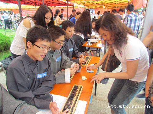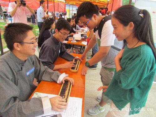 这是纺大yl23455永利官网在迎新中特地设置的“计恩算盘”环节。4名“账房先生”均是来自yl23455永利官网的男生,他们负责在迎新现场用算盘为学院的每一位新生计算出大学四年父母将为自己付出的全部花销。“学院今年共有328名新生。会计专业一年学费是5200元,住宿费是1200元,仅这两项费用四年就是25600元。”其中一名“账房先生”告诉记者。