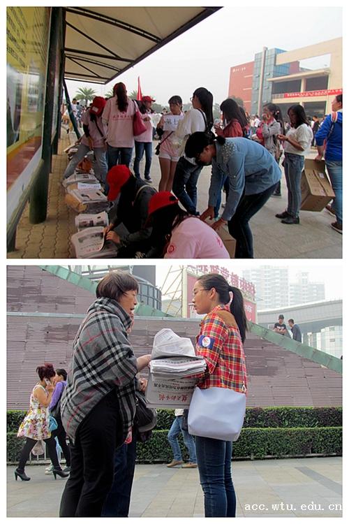 为进一步弘扬“奉献、友爱、互助、进步”的志愿者精神, 10月12日,yl23455永利官网志愿者协会组织113名志愿者前往光谷广场义务卖报。