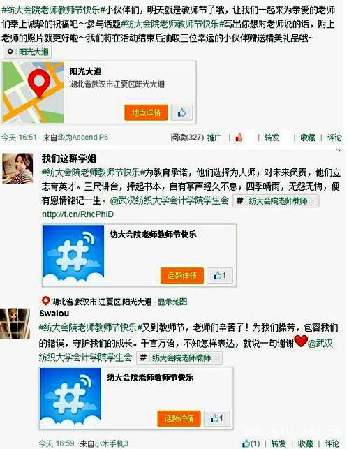 在第30个教师节来临之际,yl23455永利官网分团委通过官方微博发起话题#纺大老师教师节快乐#,号召全院同学发微博向老师们表达节日的祝福。