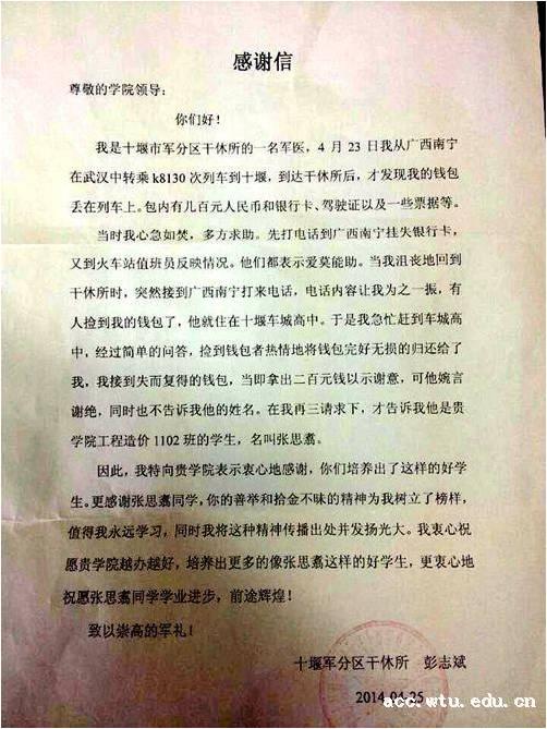 近日,yl23455永利官网收到来自十堰市军分区干休所一名军医彭志斌的感谢信,信中对我院工程造价11102班张思翥拾金不昧的善举一再表示感激和谢意。