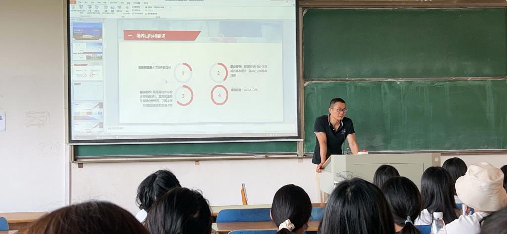 国际教育中心杨金健主任从ACCA专业的培养目标、课程体系、能力与发展入手,对ACCA课程展开了详细介绍。他指出,ACCA课程以创新和拔高人才、坚守职业操守、拓宽国际视野为主要培养目标,并强调了熟悉国内外与会计有关的方针、政策和法规的重要性。他还就ACCA专业方面的课程体系以及有关课程的英语能力、数据能力、学习能力等做了具体要求。