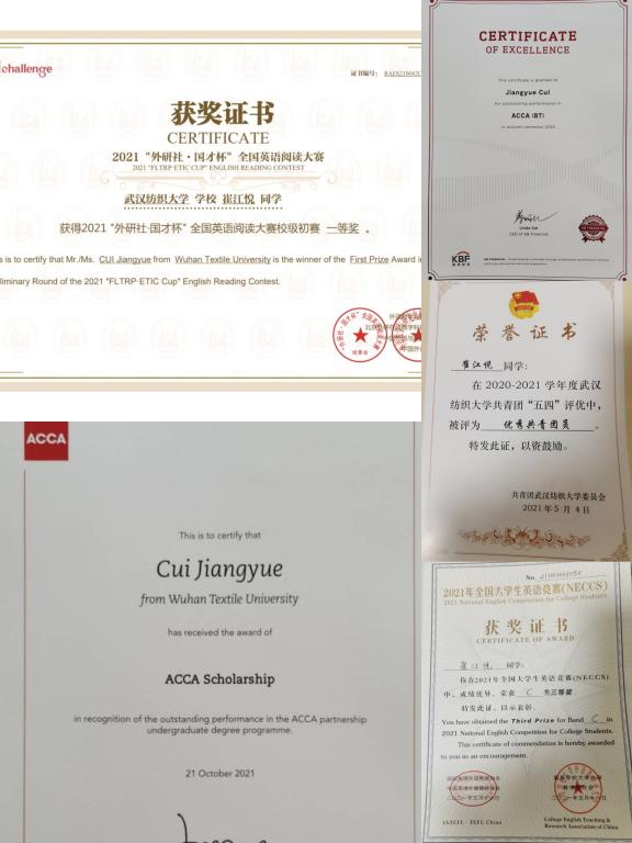 除了专业学习之外,崔江悦同学在学校开设的其他课程中也毫不懈怠,在大二学年度,崔江悦在其所在专业中综测智育排名双第一,获得国家奖学金竞选资格;在课外学科竞赛中,崔江悦同学斩获过多项奖项,其中在2022年全国大学生英语竞赛中经过认真的备赛后以全校C类非英专本科生排名前6‰的优异成绩突围进入省决赛。同寝室同学唐雨菲说道:“崔江悦同学有着超乎寻常的专注力,我看到过她在教室学习,在图书馆学习,在食堂学习,在寝室学习,无论周围的环境是安静还是吵闹,她似乎从来都不会受到影响,只要书本在她手中,她周围就像开启了一个小型异世界,在里面一待就是半天。”