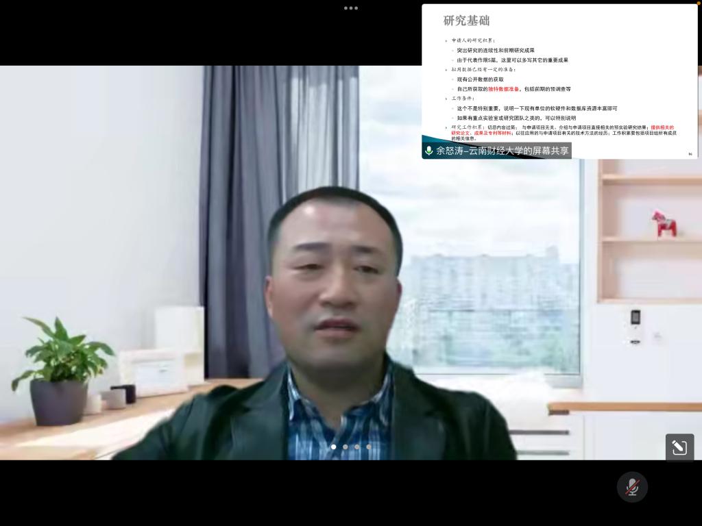 本次论坛的主题为《国家自然科学基金项目申请经验交流——评审专家视角》,有幸邀请到云南财经大学副校长余怒涛教授担任主讲人进行经验交流。yl23455永利官网院长赵立彬主持了本次论坛,学院老师、青年博士、研究生参与了本次论坛。