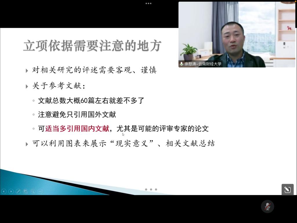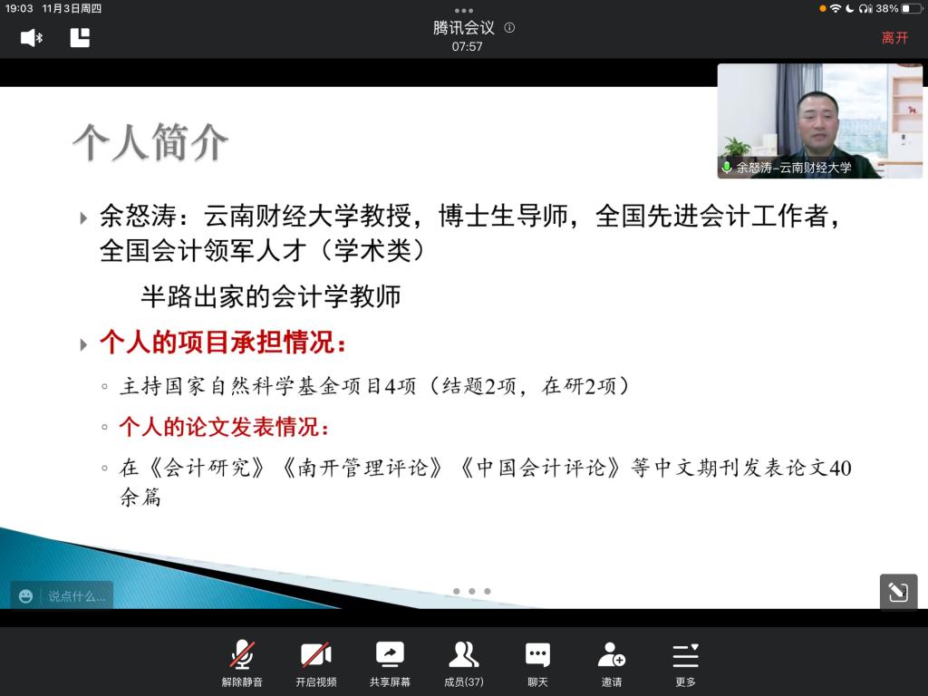 作为全国会计领军人才,余教授不仅参与研究国家自然科学基金项目,同时担任中国软科学研究会常务理事,国家自然科学基金会同行评议专家。在此次论坛中,余教授以评审专家的视角,对课题申报过程进行了详细的阐述;指导分析了项目的选题、提供了立项依据不同的撰写方法、展示了其研究方案中的技术路线图;另外,余教授也针对研究内容及其他方面的撰写提供了建设性的意见。