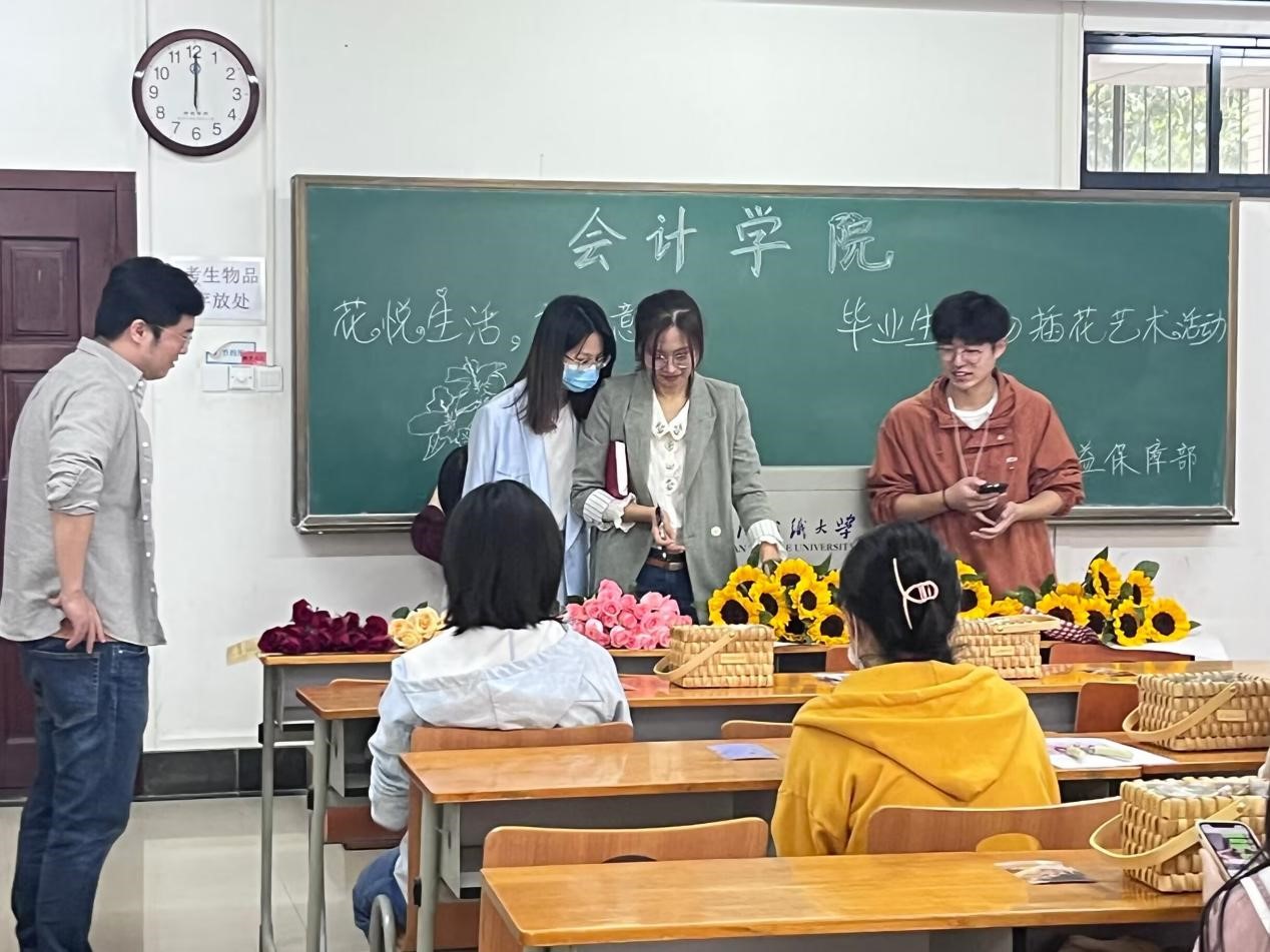 为了给毕业生搭建沟通交流的平台,帮助毕业生缓解压力、愉悦心情,11月11日上午,我院在阳光校区7栋教学楼122教室举办“花悦生活,指尖艺境”毕业生专场插花艺术活动。yl23455永利官网团委指导老师陈宇凡,2019级辅导员张秋实、查怡然以及三十余名毕业生参加了本次活动。