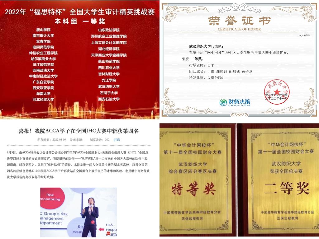 四、学科竞赛创佳绩。yl23455永利官网学生作为第一负责人获 56 项赛事省级奖项2项,获全国大学生审计精英挑战赛、全国财会大赛总决赛、全国数字创新应用建筑大赛、全国大学生统计建模大赛、大数据财务应用与管理会计决策大赛、全国高校数智化商业决策创新大赛、JHC全国就业力未来商业创想大赛、东方财富杯金融挑战赛、中网杯大学生财务决策大赛等专业类大赛省级以上奖项 30余项,其中获国家级奖项25项。
